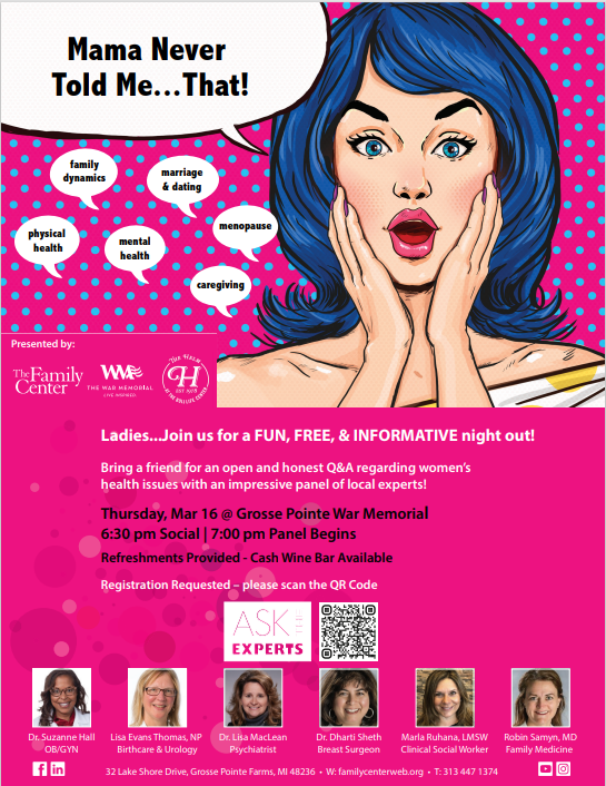 Join the Family Center of Grosse Pointe and Harper Woods, The Helm, and The War Memorial for a interactive event for women looking to engage in diverse discussions on topics to include marriage and dating, mental health, family dynamics, caregiving, aging, physical health, and much more!