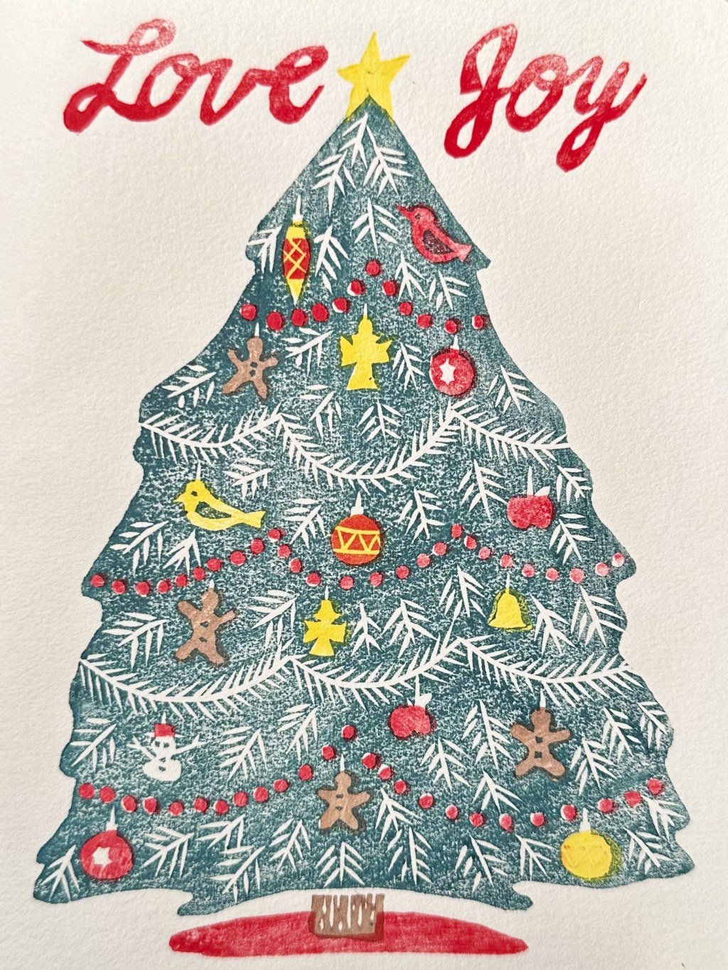 You will be able to print five cards during class and have your woodblock to make many more before the Holidays.