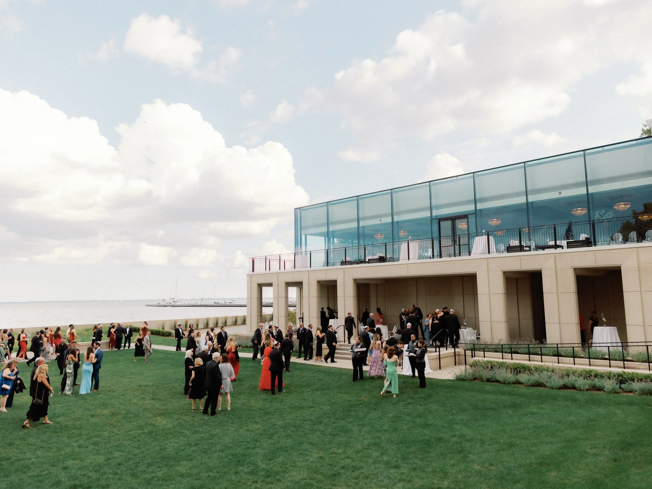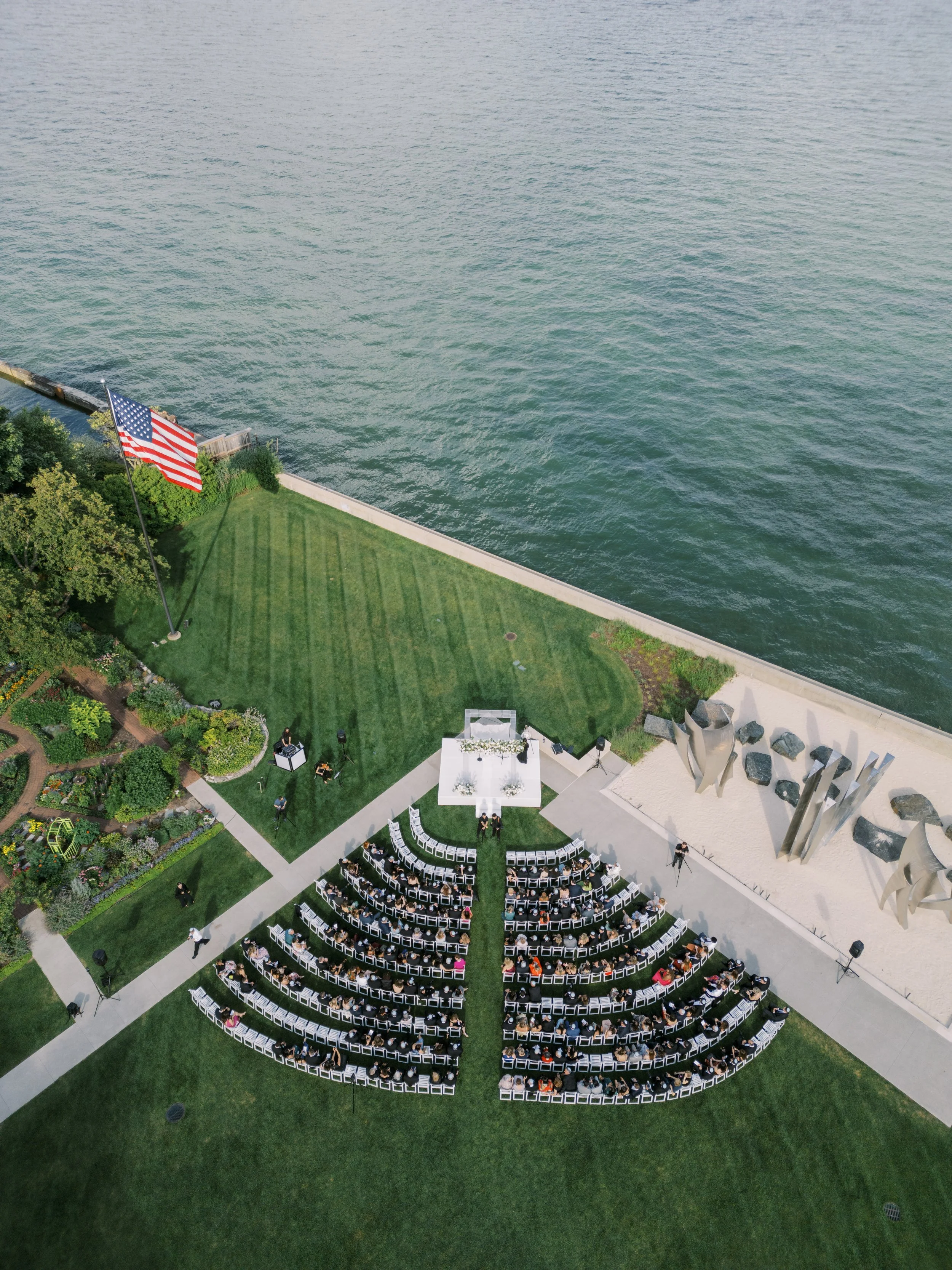Positioned just off the Alger House, these open-air spaces provide a seamless indoor-outdoor flow for cocktail hour and gatherings. Their refined furnishings and garden and lake-facing views create a relaxed yet elegant atmosphere for guests to mingle.